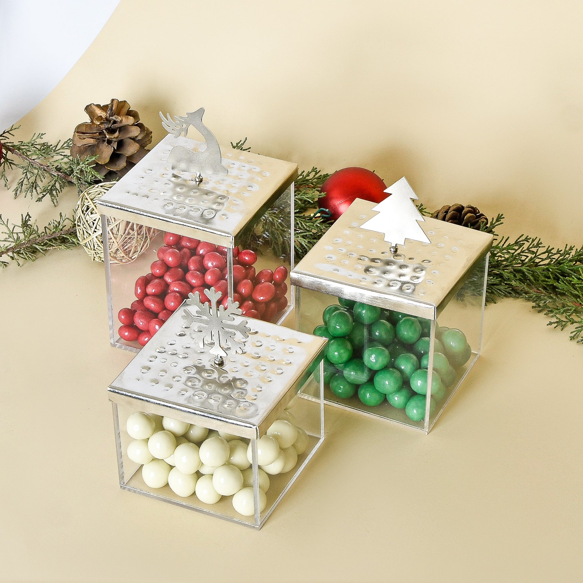 Acrylic boxes with full silver hammered metal lids, each topped with a silver ornament featuring a reindeer, Christmas tree, and snowflake. Box sizes: 12×10×10 cm, 10×10×10 cm, 10×10×8 cm.