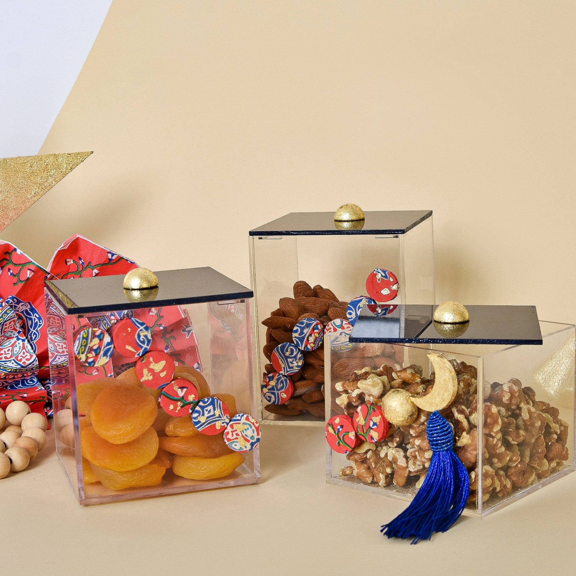 A festive set of three transparent acrylic boxes inspired by traditional Egyptian Khayamiah patterns, featuring hand-painted beaded crescent motifs enriched with gold leaf and finished with decorative tassels. Ideal for serving nuts, dates, or Ramadan sweets.