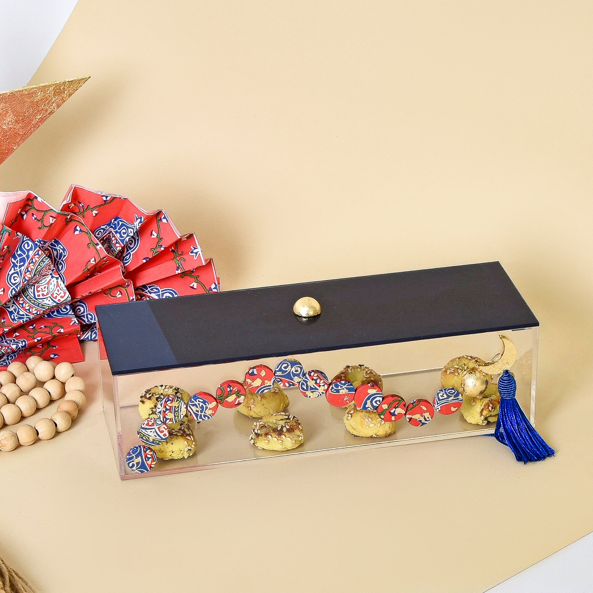 A sleek transparent acrylic rectangular box inspired by Egyptian Khayamiah patterns, featuring a hand-painted beaded crescent motif, gold leaf detailing, and a decorative tassel. Ideal for arranging pastries or sweets.