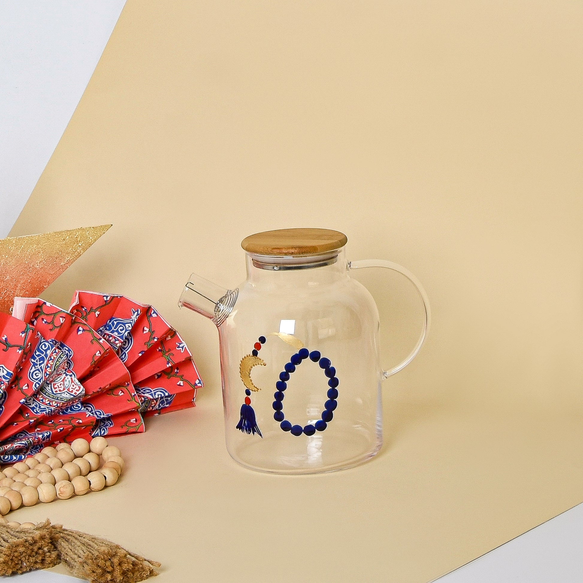 A hand-painted transparent glass tea pot inspired by Egyptian Khayamiah patterns, decorated with beaded crescent motifs and gold leaf accents. Designed to elevate tea service during Ramadan.