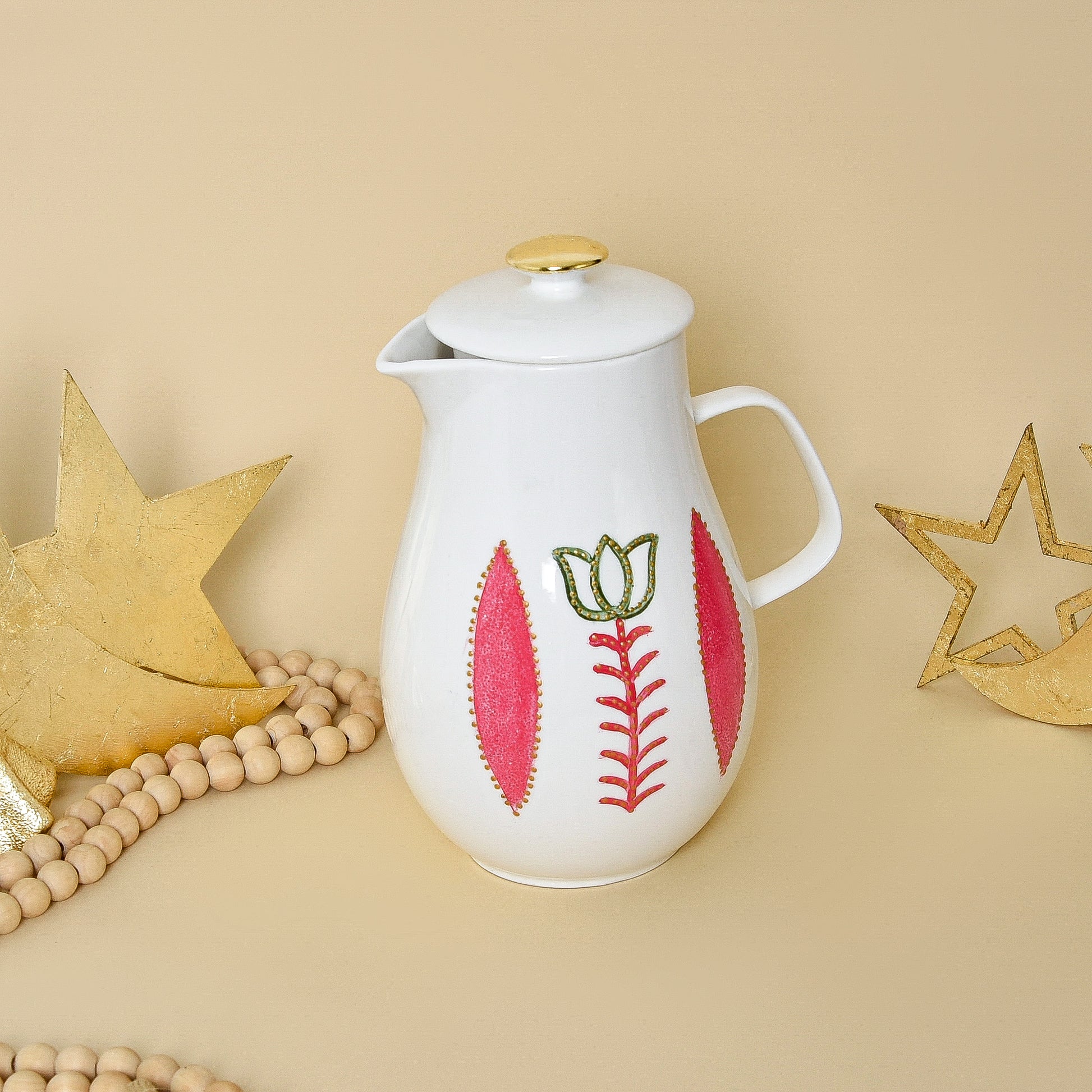 A transparent glass water carafe hand-painted with Lebanese-inspired motifs and gold accents.