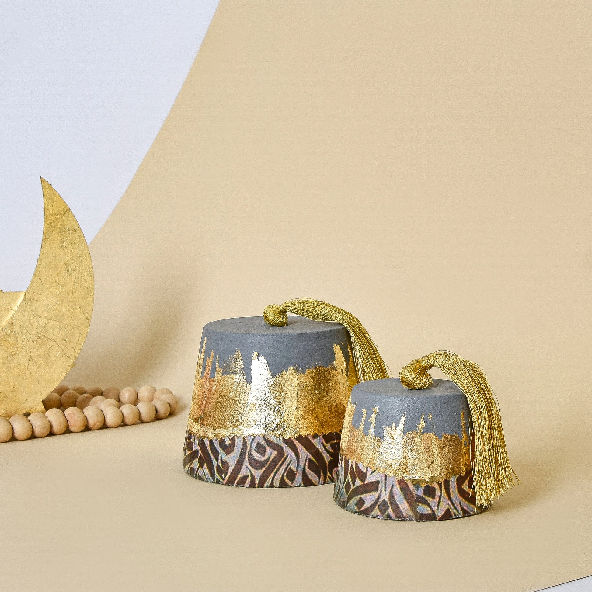 A refined ceramic tarboosh decorative set finished in soft gray tones, adorned with Arabic calligraphy-inspired print and hand-applied gold leaf accents. Completed with gold tassels, this set brings a modern yet traditional Ramadan aesthetic.
